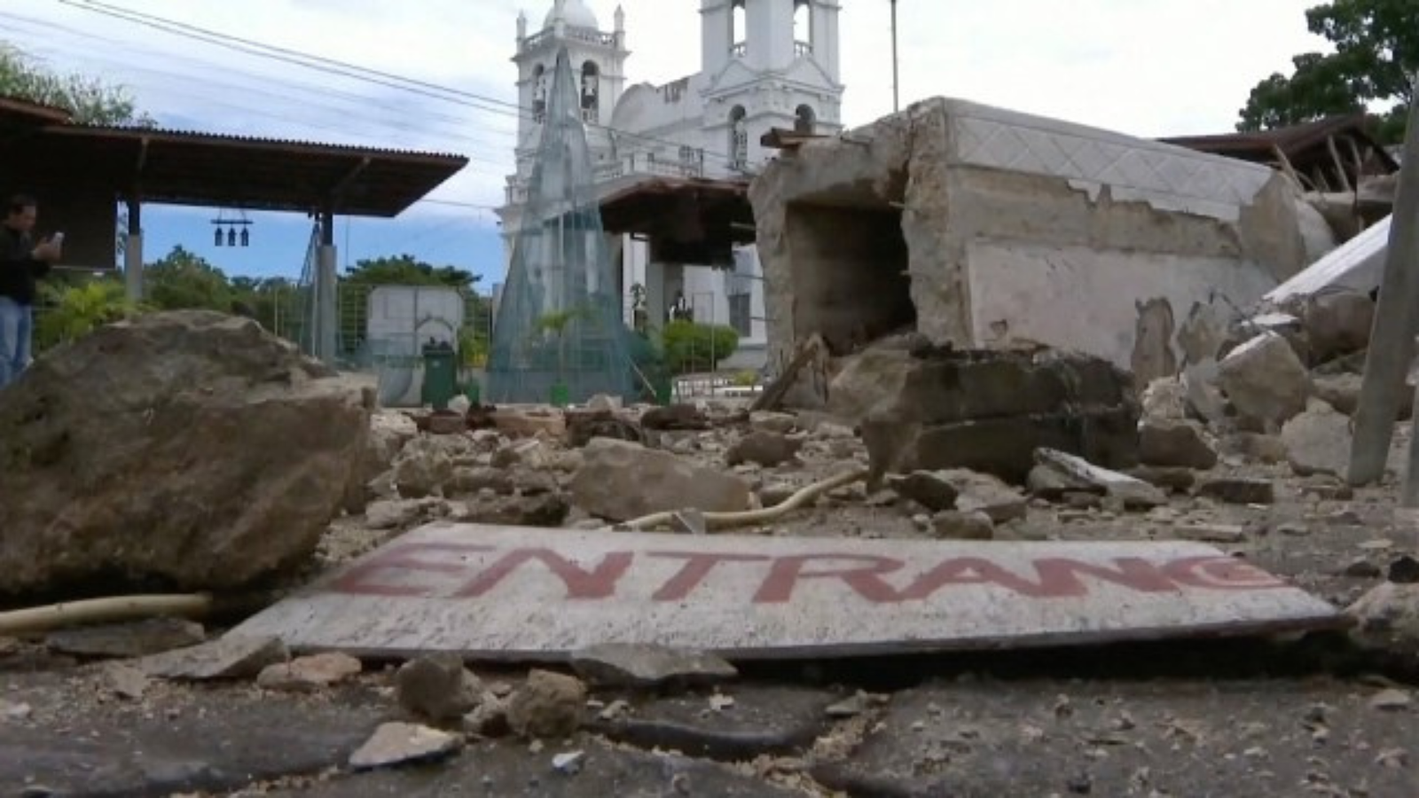 Imagens que ele filmou na cidade mostram a inclinação do prédio de uma loja de uma grande rede de hambúrgueres e as paredes externas de outro prédio reduzidas a escombros, bloqueando a via pública.